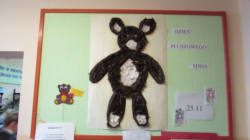 25 listopada 2015r obchodziliśmy w naszej bibliotece Światowy Dzień Pluszowego Misia, który ustanowiony został w 2002 roku, w setną rocznicę powstania tej popularnej na całym świecie maskotki, dającej poczucie bezpieczeństwa. Uroczystość ta została przedłużona aż do 30. XI aby mogły w niej uczestniczyć również dzieci z klas pierwszych. Jako pierwsi świętowanie rozpoczęli przedszkolacy z gr.V.” Biedronki”, którzy ze swoją Panią Beatą Wasilewicz odwiedzili nasza bibliotekę. Dzieci wysłuchały historii o misiu TEDY`M, zapoznały się z książkami o misiach, które są dostępne w naszej szkolnej bibliotece, a następnie wzięli się ochoczo do pracy nad wyklejaniem misiowej, futerkowej postaci. Efekt ich zmagań można obejrzeć w bibliotece. W tracie pracy słuchali piosenek o misiach i odpowiadali na pytania. Bezbłędnie umiały wymienić najbardziej popularne misie Uszatka, Kolargola , Yogi i oczywiście Kubusia Puchatka. Nie obyło się bez śpiewania popularnej piosenki „Bańkę łap”. Spotkaniu zakończyło się wspólnym zdjęciem i słodkim poczęstunkiem.