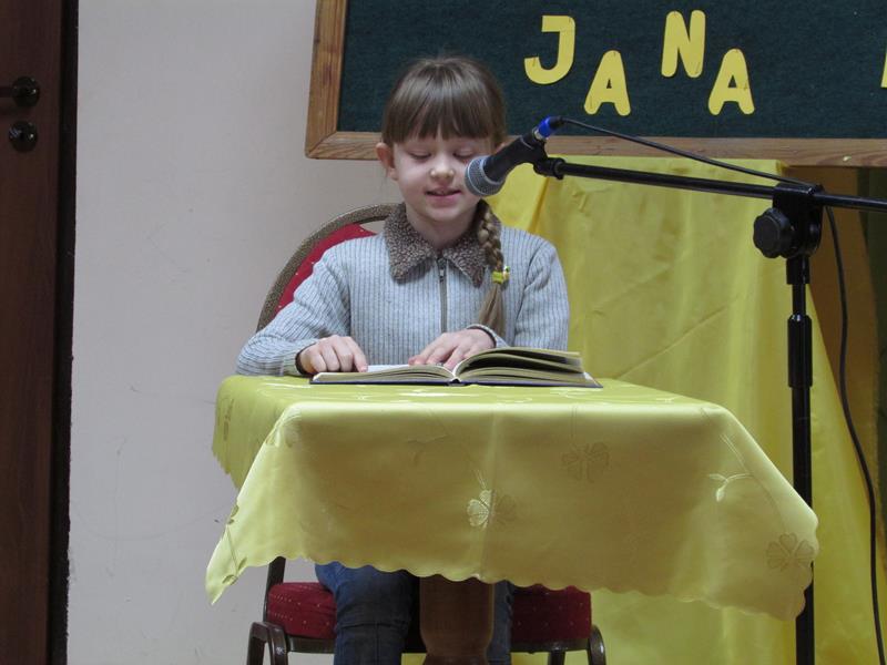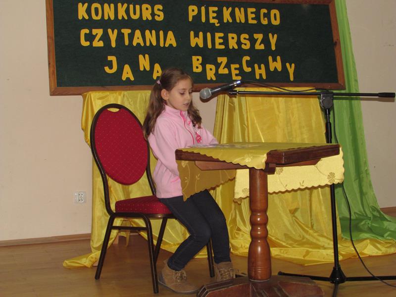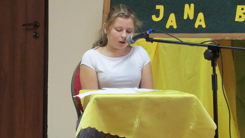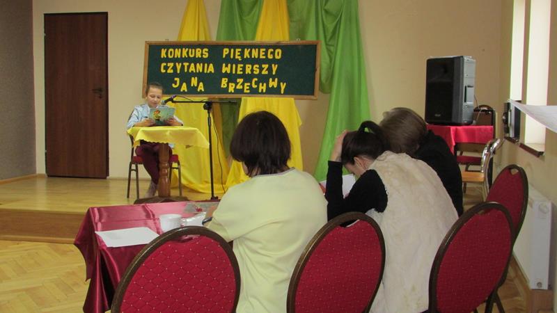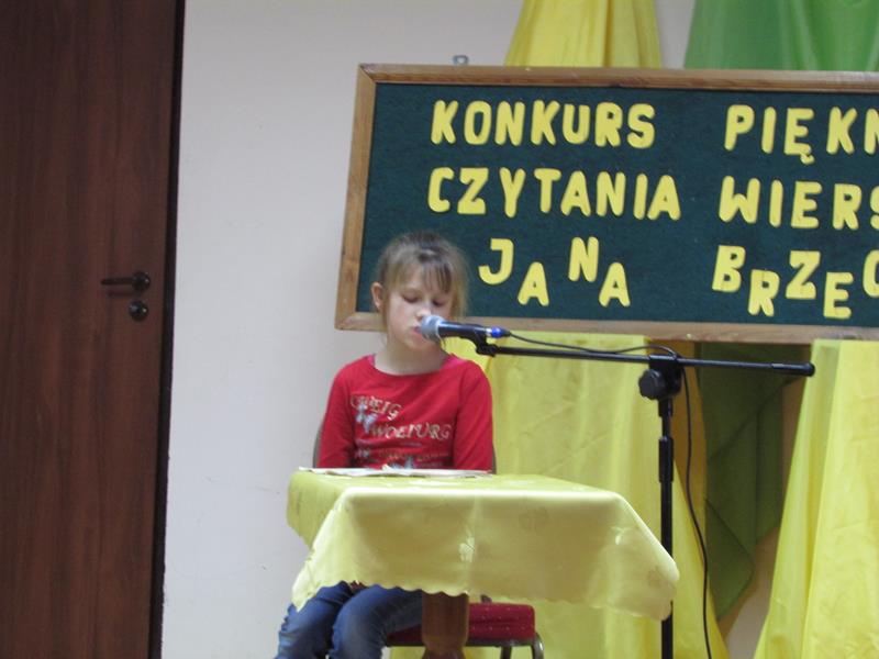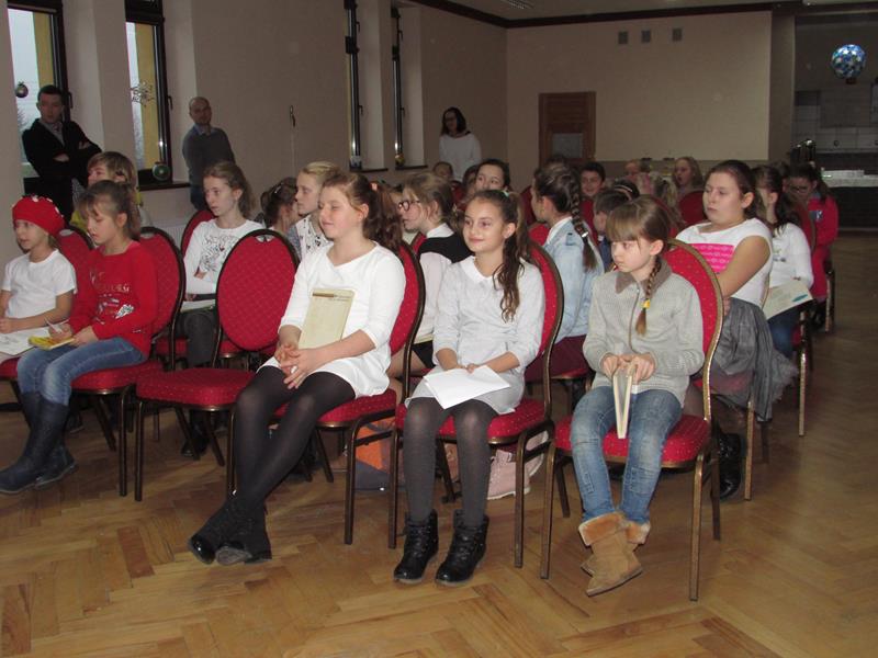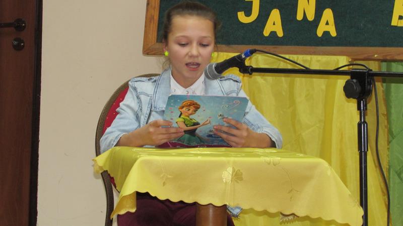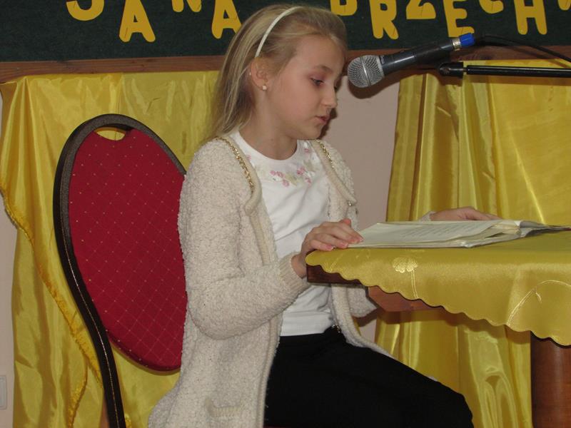O godzinie 10, po przybyciu do DOK-u, uczniowie zajęli miejsca i wylosowali numery z kolejnością prezentacji. Następnie przywitałam wszystkich uczestników przedsięwzięcia oraz członków jury: panią Annę Hińczę- Gnysińską, panią Irminę Szymkowiak oraz panią Joannę Kolendowicz. Po wstępie przyszedł czas na prezentacje uczniów. Najpierw wysłuchaliśmy występów dzieci z klas I-III, po czym przyszedł czas na starszych- klasy IV-VI. W konkursie wzięli udział następujący uczniowie: Aleksandra Dunaj, Julia Rosińska, Agnieszka Hejno, Iza Siekierzycka, Michasia Michniewicz, Kornelia Ciosmak, Róża Skarżycka, Agnieszka Haptar, Zuzia Jakubas, Emilka Buduj, Marta Gławdel, Hania Stępniewska, Amelka Mąka, Julia Żabecka, Nadia Ruda, Szymon Wiatr, Fabian Dziermański, Ela Welenc, Wiktoria Filipczak, Dagmara Sadowska, Amelia Buchajczyk, Julia Piłatowska, Maja Ochmańska, Zuzia Halec, Antonina Kozłowska, Zosia Seklecka, Martyna Staszak, Szymon Brocki, Patrycja Emilianowicz, Julia Rajtarowska, Emilka Filipowicz oraz Maja Gardian. Po części artystycznej jury udało się na obrady, a uczniowie odpoczywali, częstując się słodkościami oraz ciepłą herbatą. Po kilkunastominutowej przerwie przyszedł czas na ogłoszenie wyników. Na tę część przybył pan burmistrz- Andrzej Chmielewski, który przywitał zebranych, wręczył dyplomy wszystkim uczestnikom konkursu oraz nagrody zwycięzcom. W pionie klas I-III wygrała Marta Gławdel. Drugie miejsce zajęła Nadia Ruda, a trzecie miejsce przypadło w udziale Amelce Mące. W kategorii klas IV-VI pierwsze miejsce zajęła Hania Dziatko, drugie miejsce zajęła Kornelia Ciosmak, a trzecie miejsce zajęła Zuzanna Jakubas.