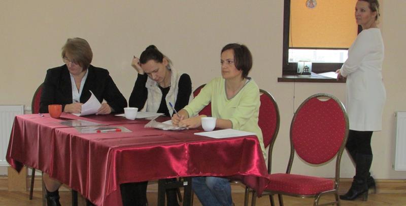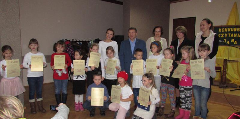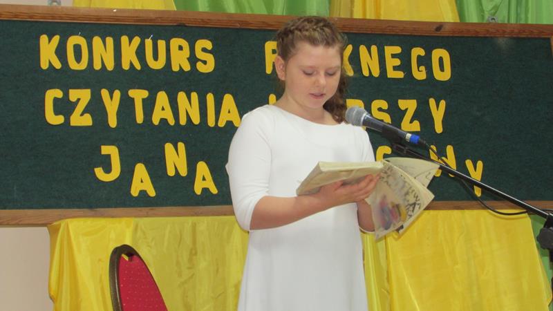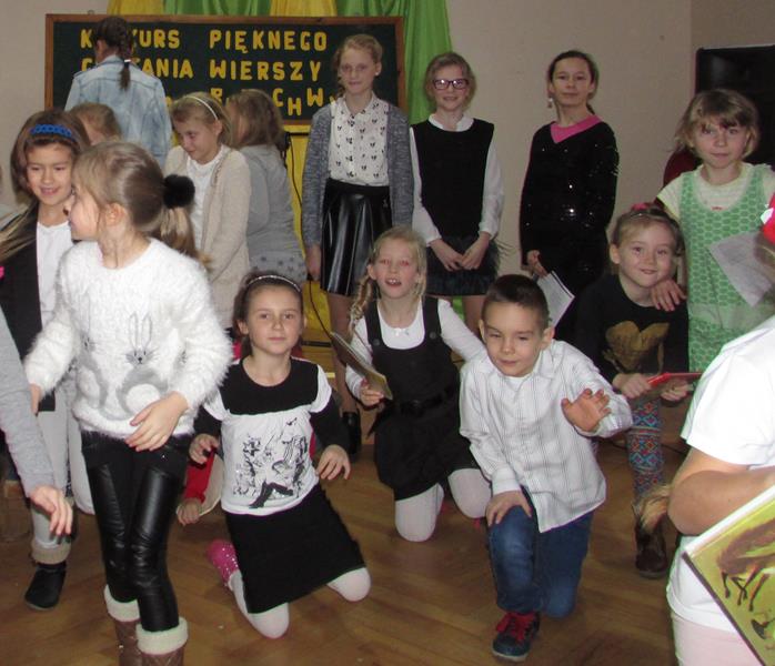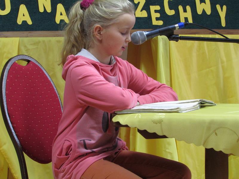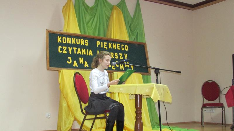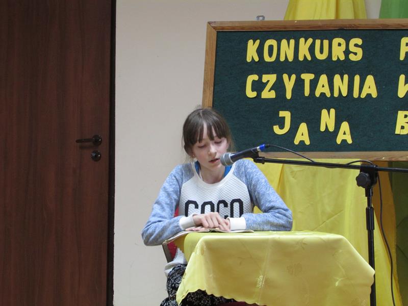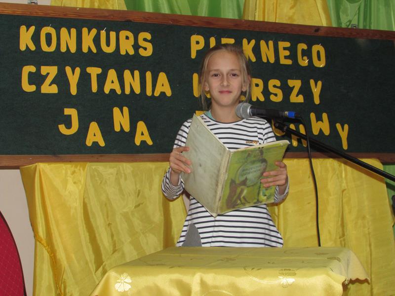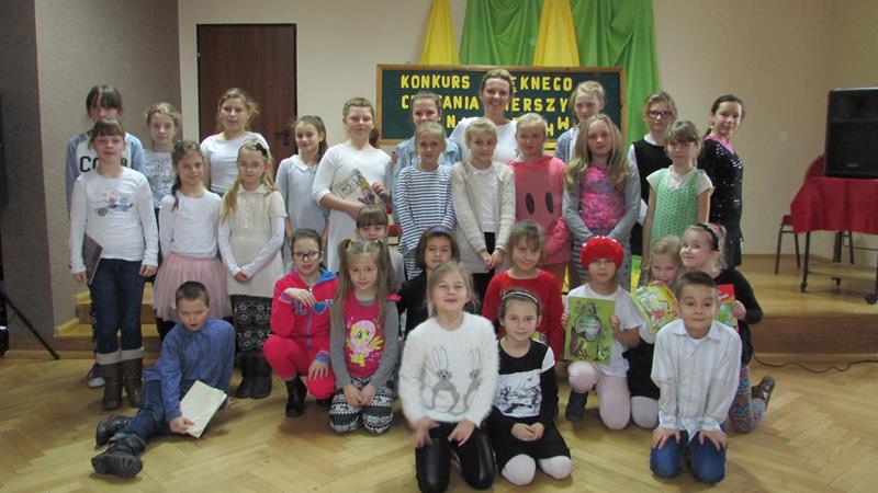O godzinie 10, po przybyciu do DOK-u, uczniowie zajęli miejsca i wylosowali numery z kolejnością prezentacji. Następnie przywitałam wszystkich uczestników przedsięwzięcia oraz członków jury: panią Annę Hińczę- Gnysińską, panią Irminę Szymkowiak oraz panią Joannę Kolendowicz. Po wstępie przyszedł czas na prezentacje uczniów. Najpierw wysłuchaliśmy występów dzieci z klas I-III, po czym przyszedł czas na starszych- klasy IV-VI. W konkursie wzięli udział następujący uczniowie: Aleksandra Dunaj, Julia Rosińska, Agnieszka Hejno, Iza Siekierzycka, Michasia Michniewicz, Kornelia Ciosmak, Róża Skarżycka, Agnieszka Haptar, Zuzia Jakubas, Emilka Buduj, Marta Gławdel, Hania Stępniewska, Amelka Mąka, Julia Żabecka, Nadia Ruda, Szymon Wiatr, Fabian Dziermański, Ela Welenc, Wiktoria Filipczak, Dagmara Sadowska, Amelia Buchajczyk, Julia Piłatowska, Maja Ochmańska, Zuzia Halec, Antonina Kozłowska, Zosia Seklecka, Martyna Staszak, Szymon Brocki, Patrycja Emilianowicz, Julia Rajtarowska, Emilka Filipowicz oraz Maja Gardian. Po części artystycznej jury udało się na obrady, a uczniowie odpoczywali, częstując się słodkościami oraz ciepłą herbatą. Po kilkunastominutowej przerwie przyszedł czas na ogłoszenie wyników. Na tę część przybył pan burmistrz- Andrzej Chmielewski, który przywitał zebranych, wręczył dyplomy wszystkim uczestnikom konkursu oraz nagrody zwycięzcom. W pionie klas I-III wygrała Marta Gławdel. Drugie miejsce zajęła Nadia Ruda, a trzecie miejsce przypadło w udziale Amelce Mące. W kategorii klas IV-VI pierwsze miejsce zajęła Hania Dziatko, drugie miejsce zajęła Kornelia Ciosmak, a trzecie miejsce zajęła Zuzanna Jakubas.