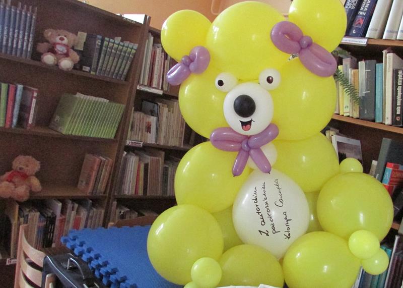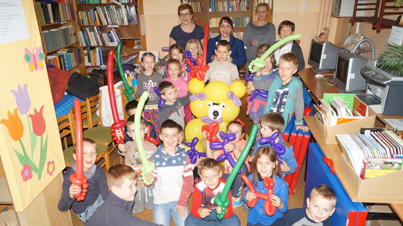 Na zakończenie, każde dziecko otrzymało prezent, dziewczynki balonowego pieska, a chłopcy balonowy miecz. Natomiast klasy dostały upominki w postaci balonowego Minionka lub Hello Kitty. Biblioteka również powiększyła swoje zbiory o przepięknego misia z balonów, z autografem pisarki. Spotkanie przebiegało w miłej i ciepłej atmosferze. Za przesympatycznie spędzony czas uczniowie podziękowali Pani Katarzynie specjalnym upominkiem.