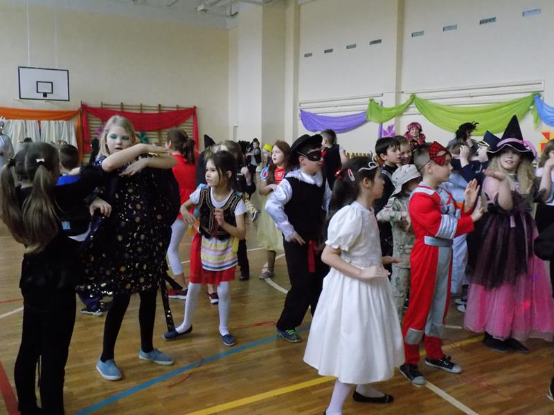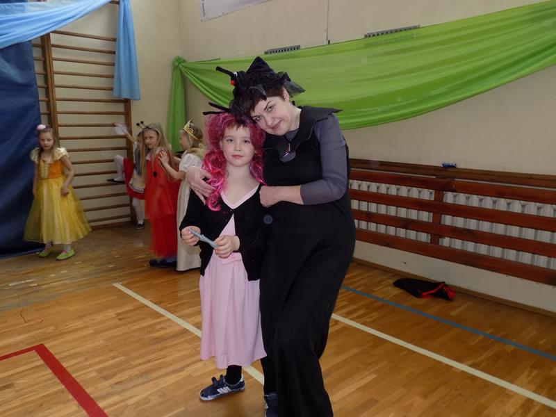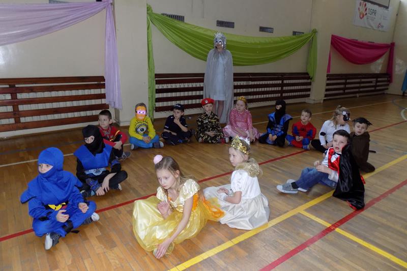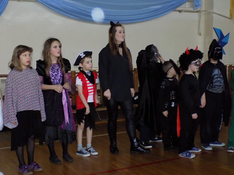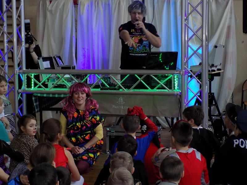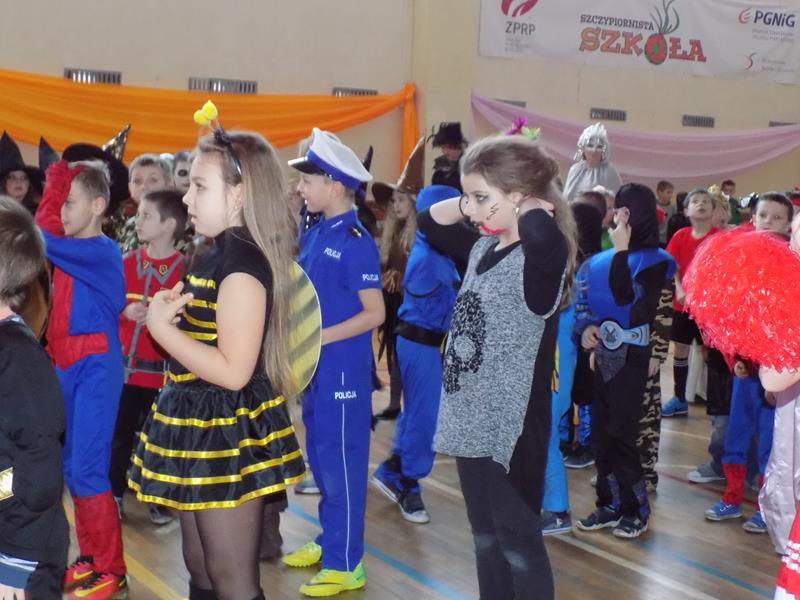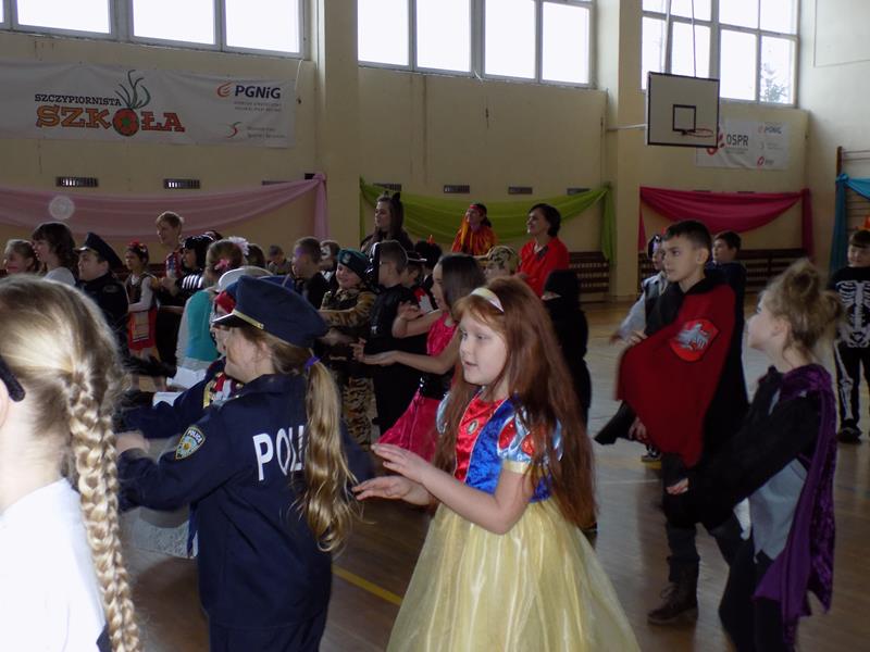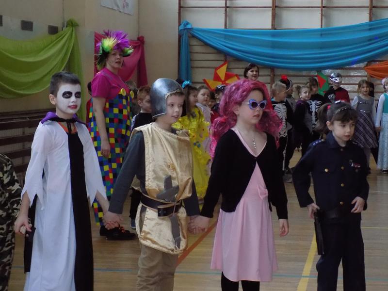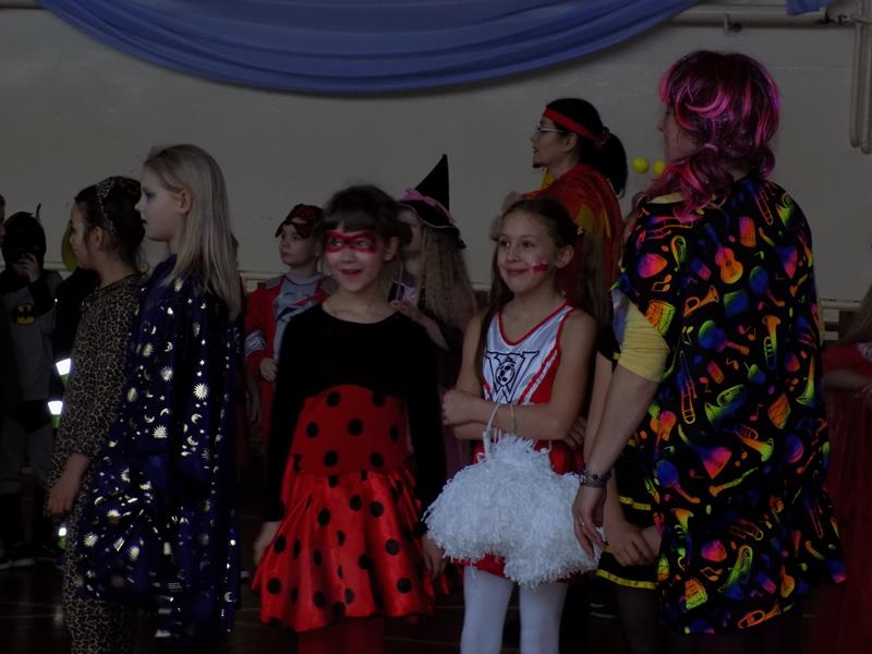 Po powitaniu przez panią dyrektor dzieci chętnie ruszyły w tany, a pan Irek, nasz zaprzyjaźniony DJ dwoił się i troił, aby wszyscy pięknie się bawili przy specjalnie dobranej muzyce. I tak np.: Motyl tańczył z Pająkiem, Wróżka z Czarownicą, Czerwony Kapturek z Wilkiem, Policjant z Kotem, Superman z Pszczółką itd. Było tak wiele przebrań, że nie sposób wszystkie wyliczyć. Nawet kilku chłopców przebrało się za dziewczynki tak, iż nie można ich było rozpoznać.