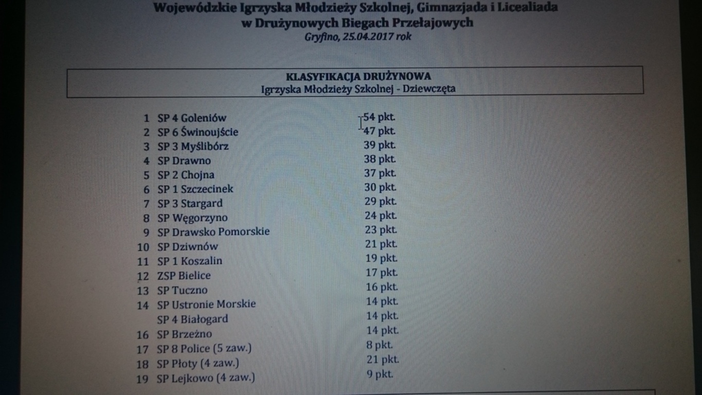 Nasze dziewczyny zajęły czołowe miejsca w swoich biegach, co pozwoliło ostatecznie zająć IV miejsce (strata do miejsca III – 1 punkt!) w Wojewódzkich Drużynowych Biegach Przełajowych.