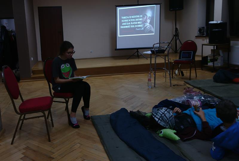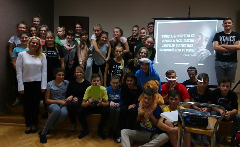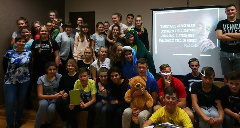 Myślę, że noc z książką Coelho można zaliczyć do udanych. Młodzieży podobał się wybrany tekst i cieszymy się, że zachęciło to naszych uczniów do sięgnięcia po inne utwory tego pisarza. Dziękujemy rodzicom za upieczenie na tę okazję ciasta ( państwu Skrzypiec, Słotwińskim, Hejza) , pani dyrektor DOK-u za udostępnienie nam sali, a paniom z Biblioteki Publicznej za udostępnienie projektor