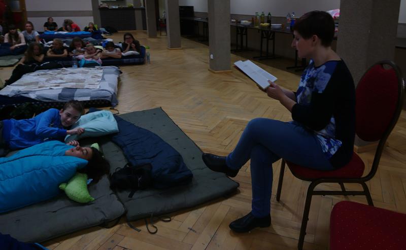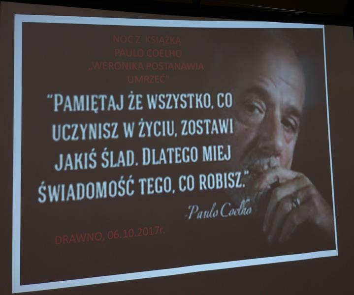 Dnia 6 października 2017r. w ramach Międzynarodowego Miesiąca Bibliotek Szkolnych mieliśmy okazję po raz drugi przygotować dla naszej młodzieży noc z książką. W tym roku wybrałyśmy książkę Paulo Coelho- „Weronika postanawia umrzeć”. W spotkaniu wzięło udział 37 uczniów naszej szkoły. Spotkaliśmy się w sali biesiadnej Drawieńskiego Ośrodka Kultury o godz. 19. Po krótkiej chwili potrzebnej na organizację, przygotowałyśmy kolację w postaci hot- dogów, po czym rozpoczęłyśmy czytanie lektury. Czytałyśmy na zmianę z uczniami- ochotnikami. Noc mijała w miłej atmosferze. Kiedy zakończyliśmy czytanie, uczniowie mogli obejrzeć filmy. Rano przygotowałyśmy tosty, po czym wszyscy wrócili do domu.