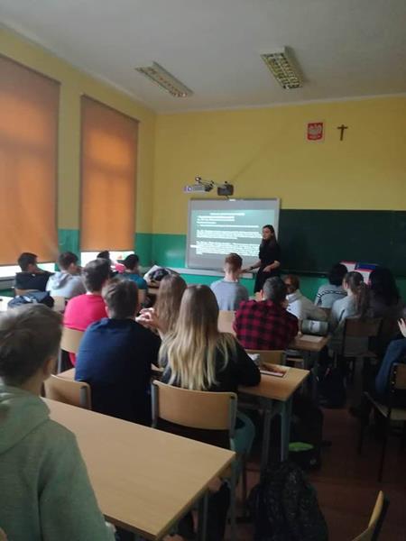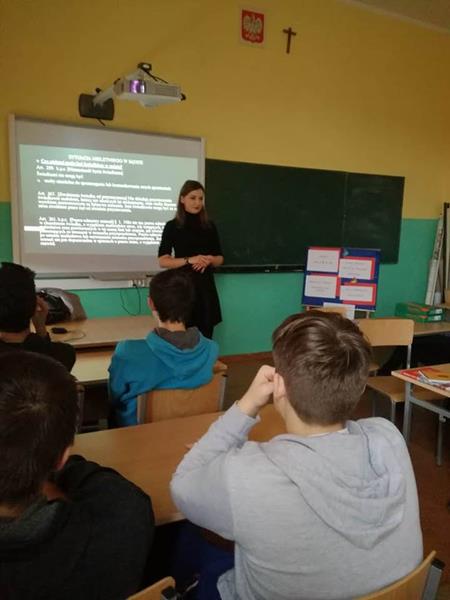 W drugiej części spotkania skupiliśmy się głównie na tematach bliskich uczniom. Interesował nas głównie internet -niebezpieczeństwa jakie się z nim wiążą i przepisy regulujące korzystanie z niego. Osoba prowadząca jasno określiła z których dobrodziejstw internetu możemy spokojnie korzystać, a które stanowią zagrożenie bądź wykluczenie. Po spotkaniu wiemy już, jak należy zachować się w nietypowych sytuacjach i jak ważną rzeczą jest uważność i roztropność w podejmowaniu różnych decyzji. Pozostały czas wypełniły pytania związane z sytuacją szkolną , rodzinną uczniów oraz z zakresu prawa rodzinno-opiekuńczego. Ostatecznie wszystkie wątpliwości zostały rozwiane.