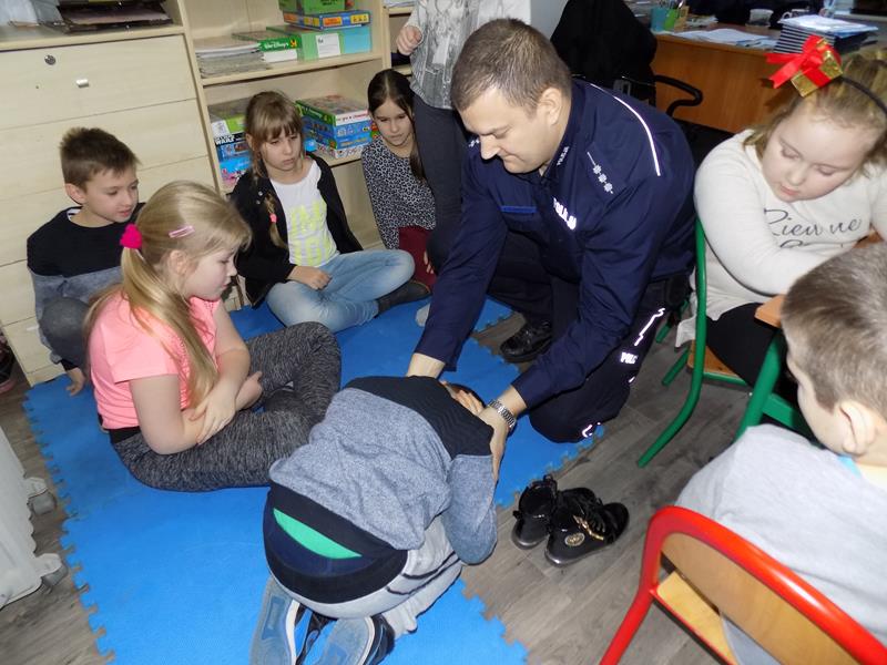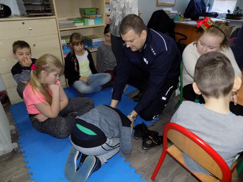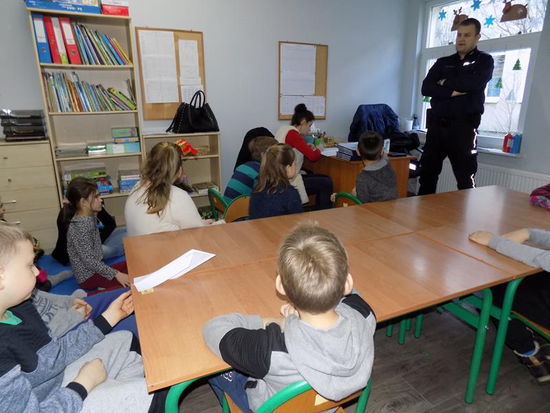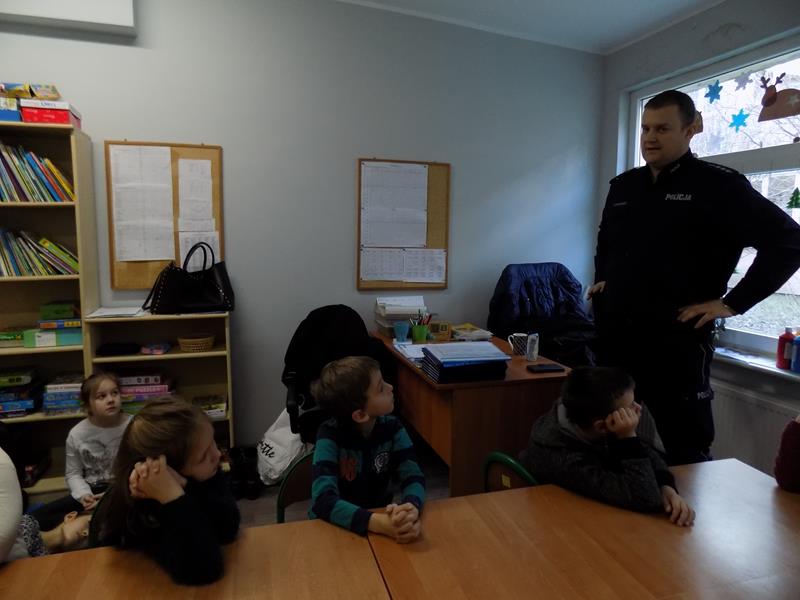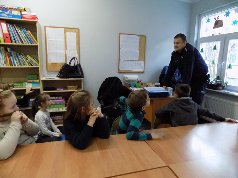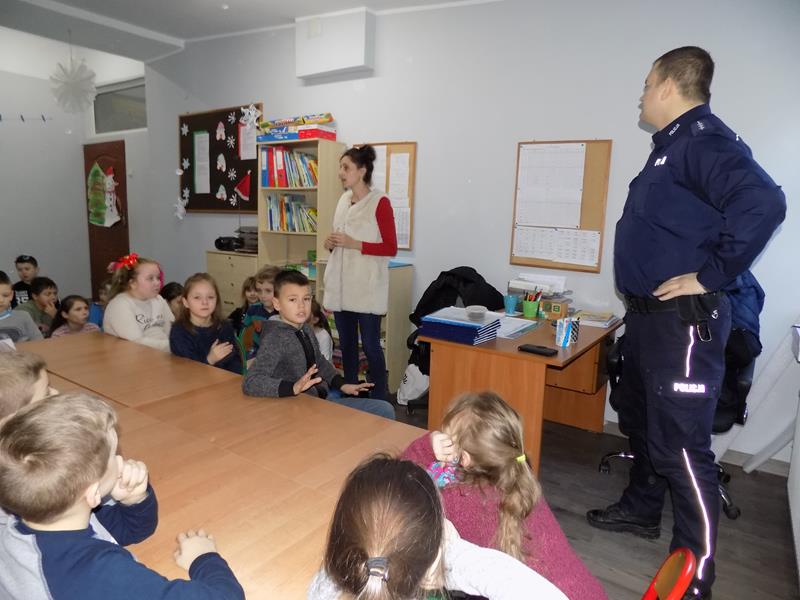 Dbając o bezpieczeństwo naszych dzieci w czasie wolnym od zajęć dydaktycznych w dniu 8.01.2018 r. odbyło się spotkanie profilaktyczno-edukacyjne z Panem Januszem Szymkowiakiem- funkcjonariuszem Policji, które zorganizowała Barbara Pawłowska - wychowawca świetlicy szkolnej. W spotkaniu brały udział dzieci z klasy I a, I b oraz III c.
