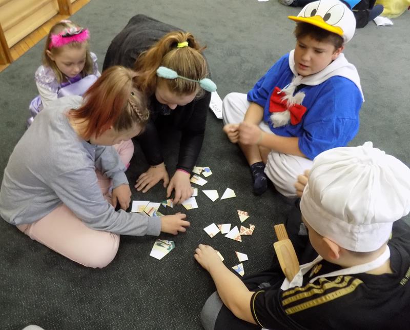 Dzieci przybyły do szkoły przebrane w przepiękne bajkowe stroje. Uroczystość przygotowały panie z bibliotekarki Dorota Konopelska i Elżbieta Koziorowska. Świętowanie rozpoczęły klasy III a, b i I b, natomiast drugą grupę tworzyli uczniowie klas IIa, b oraz Ia Bajkowe spotkanie rozpoczęło się korowodem bajkowych postaci, za które przebrały się dzieci. Przy muzyce "Witajcie w naszej bajce" dzieci prezentowały swoje piękne stroje. Podczas zajęć najmłodsi mieli szansę wykazać się znajomością bajek i baśni. Okazało się, że uczniowie doskonale znają ich bohaterów i nie mieli żadnych trudności z ich odgadywaniem.Uczestnicy wysłuchali fragmentów najbardziej znanych bajek, rozpoznawali postacie i tytuły bajek, z których pochodzą. Układali puzzle, wcielali się w rolę Kopciuszka rozdzielając groch od fasoli. Grali rolę bohaterów Czerwonego Kapturka. Na zakończenie uczniowie otrzymali słodki upominek. Każdej klasie został wręczony dyplom za aktywne uczestnictwo w zajęciach bibliotecznych z okazji Dnia Postaci z Bajek oraz egzemplarz baśni do czytania w klasie. Zabawa była bardzo ciekawa, żywa, a dzieci doskonale bawiły się wykazując dużą wiedzę ze znajomości bajek.
