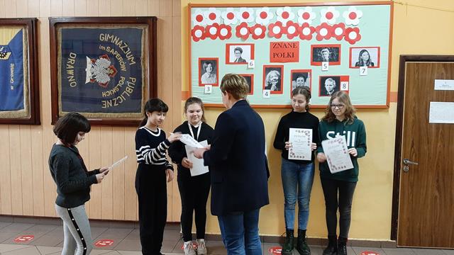 Roztrzygnieto konkurs z okazji Dnia kobiet pt. "Znane polki" zorganizowany przez Dorotę Konopelską - nauczyciela bibiotekarza i panią Małgorzatę Dolatę-Trzaskawka -polonistę. Zadaniem uczniow było dopasowanie numerów postaci znajdujących sie na gazetce ściennej do ich imion i nazwisk . Wśród osób poprawnie udzielonych odpowiedzi znalazly się same dziewczyny, które otrzymały dyplomy. A były to: