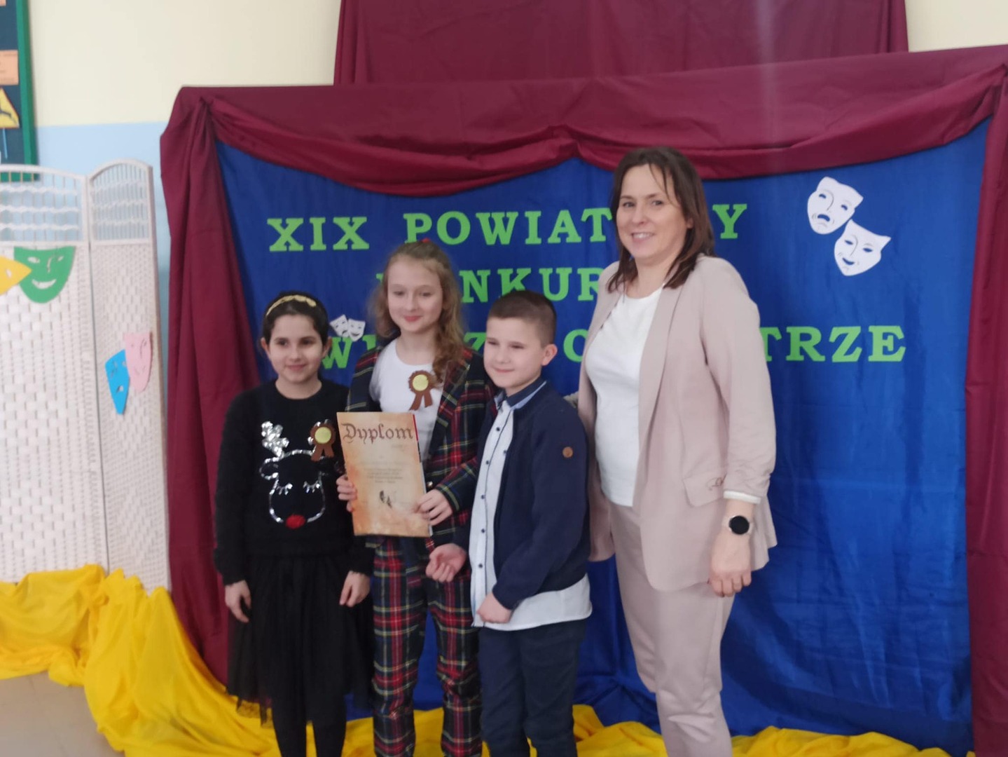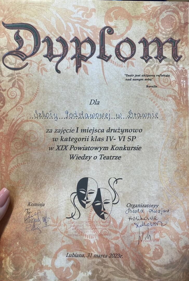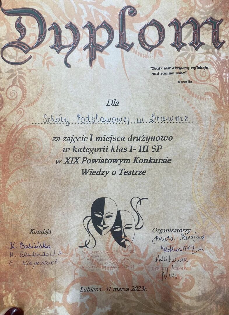31 marca 2023r. uczniowie ze Szkoły Podstawowej w Drawnie wzięli udział w XIX Powiatowym Konkursie Wiedzy o Teatrze w Lubianie. Sześcioro uczniów: Bianka Krykwińska (IIIa), Julia Łubińska- Wiewióra (IIIb), Arkadiusz Nowak (IIIa), Martyna Cichocka (IVa), Iga Nowak (Vb) i Miłosz Kowalczyk (VIa), rywalizowało w 2 kategoriach: klas I-III i IV- VI. Zostali oni przygotowani przez p. Mirosławę Lewandowską i p. Edytę Musiałek.