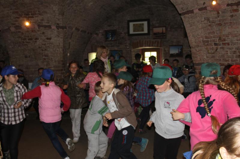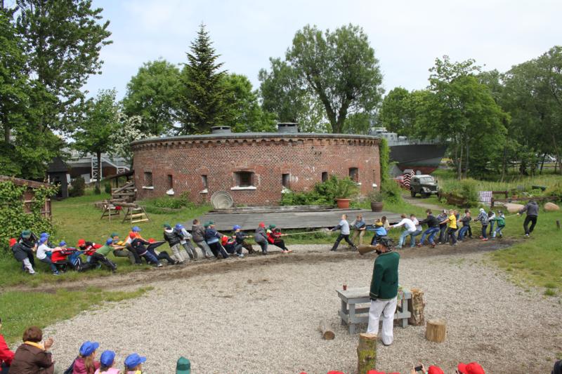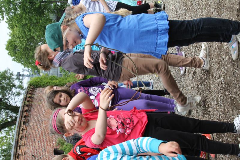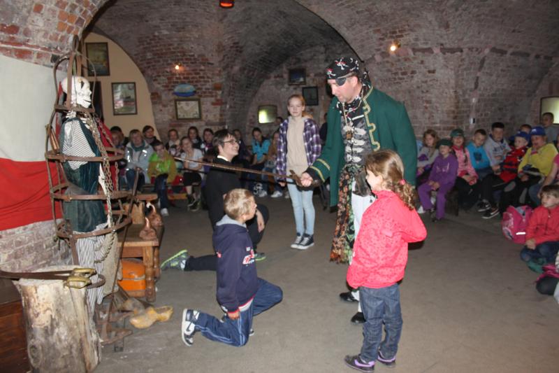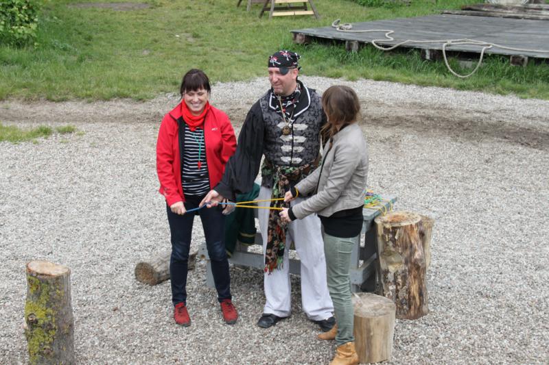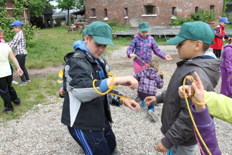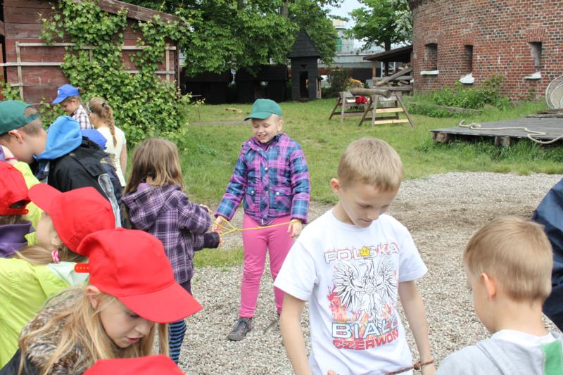 Następnie zawitaliśmy do Fortu Pirackiego, gdzie przesympatyczni panowie piraci wprowadzili nas w arkana swojego "zawodu". Bardzo sumiennie uczyliśmy się sztuki piractwa. Zakładaliśmy liny na kołki, wbijaliśmy gwoździe w pień drzewa, próbowaliśmy się wyplątywać z węzłów pirackich, prowadziliśmy walki na poduchy, tańczyliśmy przy muzyce szanty i wiele, wiele innych zabawnych ćwiczeń. Cały czas konkurowaliśmy z uczniami ze szkoły podstawowej z Rzyszowa ( nie z Rzeszowa), którzy byli od nas dużo starsi. Jednak dzielnie dawaliśmy sobie radę i w wielu konkurencjach pokonaliśmy naszych nowopoznanych kolegów.