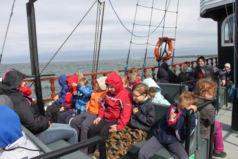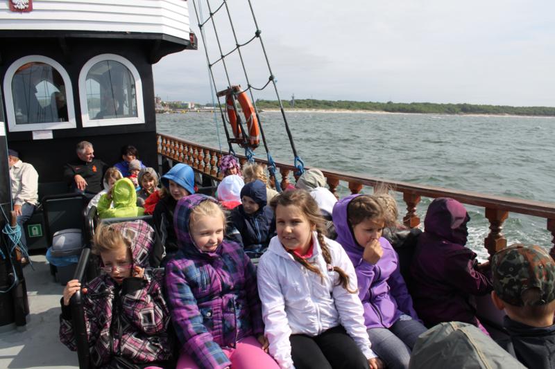 Po złożeniu przysięgi pirackiej i pysznym obiedzie mogliśmy wypłynąć w morze. Wiatr był silny i nieźle bujało stateczkiem o nazwie "Pirat", ale i to dzielnie przetrwaliśmy.